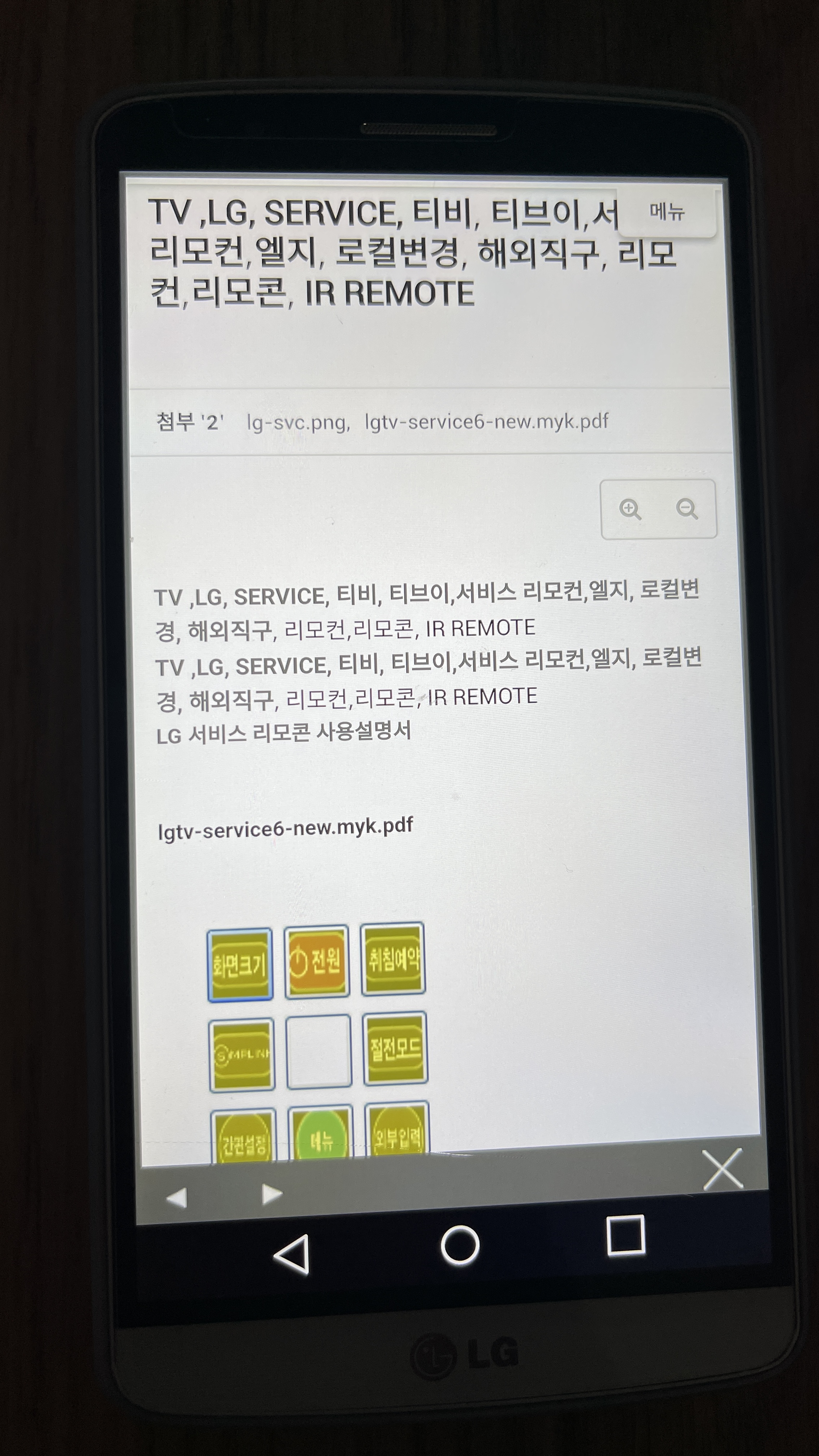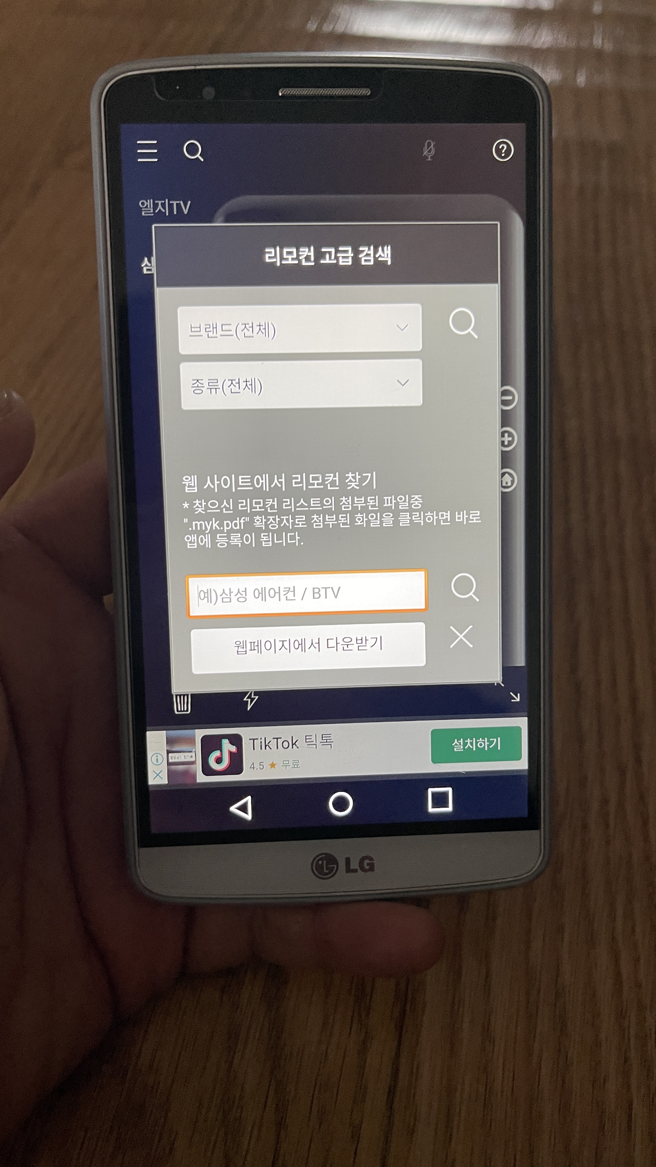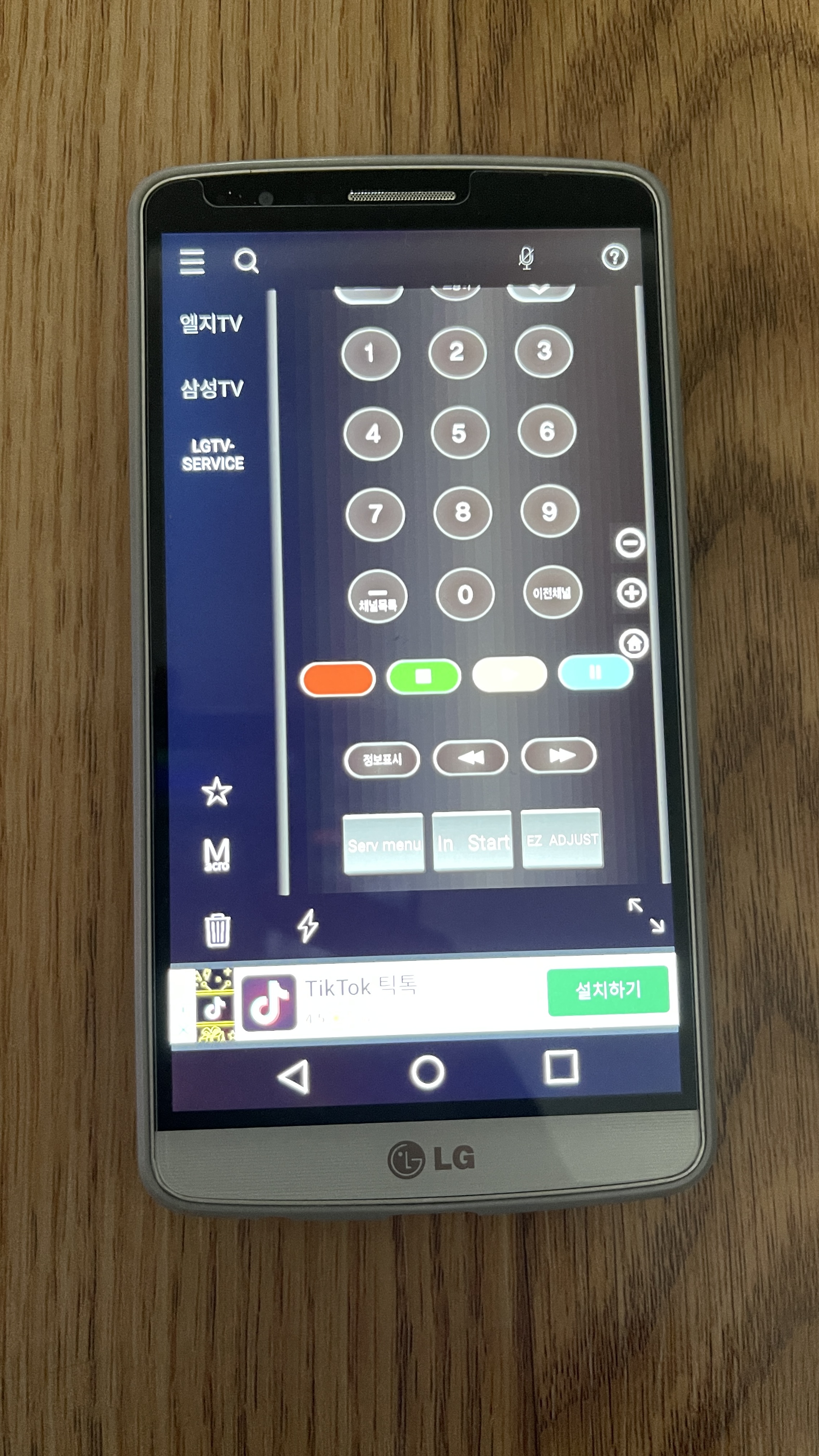 그리고나면 마이리모콘어플 좌측하단에 lgtv service 항목이 생기고. 리모콘하단 좌측의 ser menu 를 선택한다. (폰을 tv방향을 향한 상태로)
